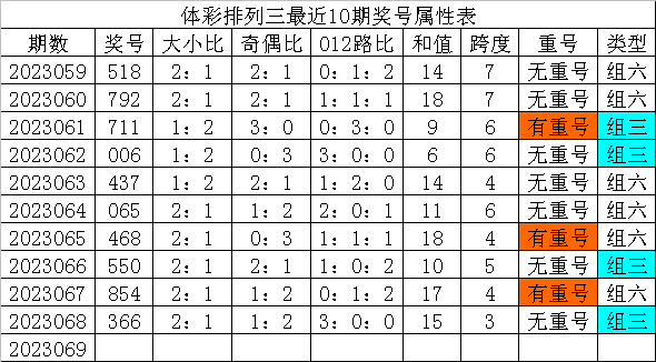 体彩排列三最近10期分别开出奖号:518、792、711、006、437、065、468、550、854、366,各奖号属性详见下表: