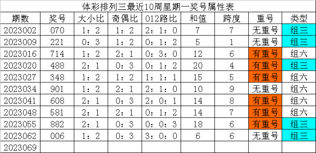 体彩排列三最近10周星期一奖号分别为:070、221、714、488、348、901、608、581、882、006,各奖号属性详见下表: