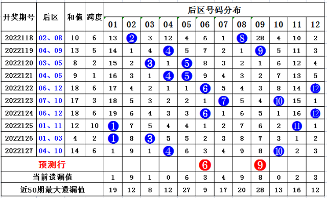 跨度分析:上期跨度18,较126期下降13个点,近5期跨度分别为28、28、16、31、18,本期预计跨度上升6个点位,关注跨度出现在24左右。