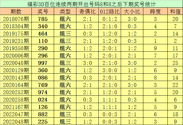 百位号码:连续两期百位出号分别为:8-8,历史上福彩3D连续两期前后分别出号8-8的奖号共出现81次。在百位8-8的奖号现象出现时,近15期下期分别出号:785-340-464-110-290-296-997-360-086-769-974-024-126-882-225;