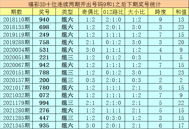 十位号码:前两期十位分别出现奖号9-1,历史上福彩3D连续前后分别开出号码9-1的现象共开出77次。在十位9-1的现象出现时,最近15期其下期分别开出号码:940-698-249-758-531-221-942-788-200-780-072-994-276-447-935;