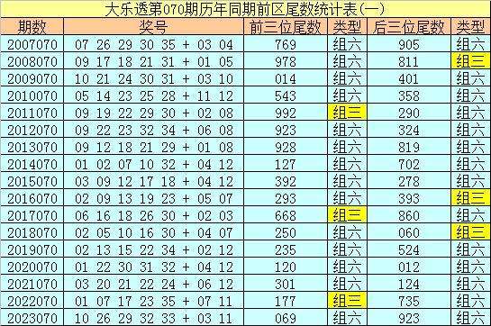 在大乐透第070期历年同期奖号中,前区后三位尾数出号频次分别为:尾数0、2出现8个,尾数1、3出现6个,尾数8、9出现5个,尾数4、5出现4个,尾数7出现3个,尾数6出现2个。其中尾数数字三类型豹子、组三、组六次数比为0:3:14,今年同期后三位尾数类型参考组六;