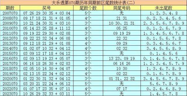 大乐透历年同期第070期后区尾数奇偶比为14:20,最近5年尾数奇偶比为4:6,后区尾数大小比为10:24,最近5年尾数大小比为2:8,本期后区注意号码04、06、08、10、12,后区两码关注06、08。