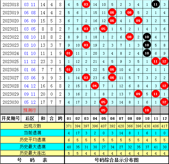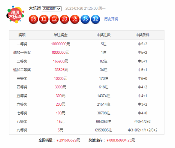 上期开奖:大乐透第2023030期开奖号码:06 11 12 20 35+05 12。其中前区号码012路比为2:0:3,奇偶比为2:3,大小比2:3。后区和值为17,跨度为7。