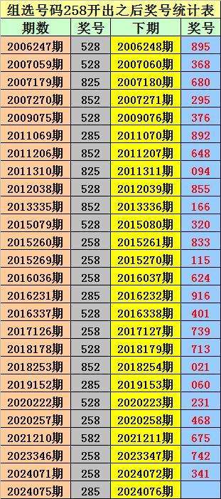 排列三组选258出现之后下期分别开出:895、368、680、295、376、892、648、094、855、166、320、833、115、624、916、401、739、713、021、060、231、468、675、742、341。