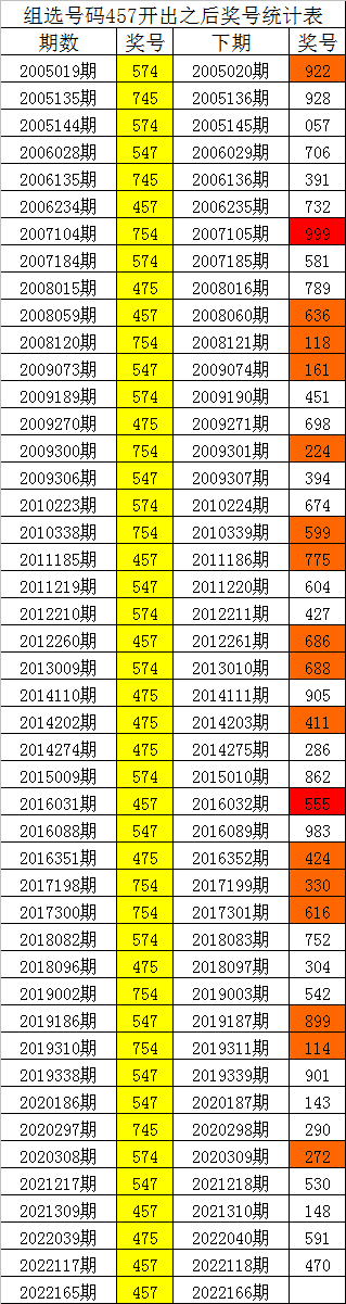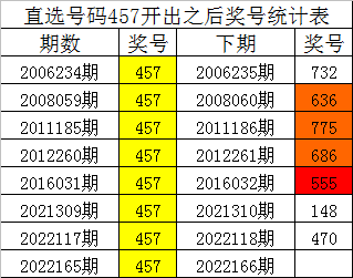 从上表统计可以看出,直选号码457开出之后,其下期奖号: