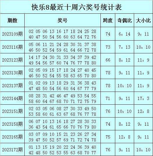 福彩快乐8第2023178期开奖回顾:05 10 11 12 16 18 21 30 34 35 44 50 51 53 55 56 57 64 71 73,其中奖号奇偶比为10:10,大小比为10:10,012路比为6:6:8,首尾间距为68。