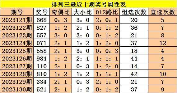 上期回顾:体彩排列三第2023130期奖号:521,奇偶比2:1,大小比1:2,012比0:1:2。