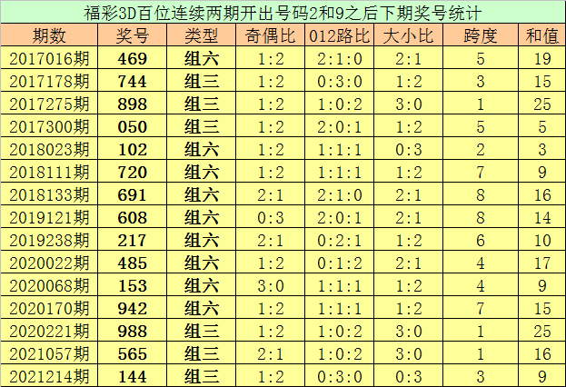 百位号码:连续两期百位出号分别为:2-9,历史上福彩3D连续两期前后分别出号2-9的奖号共出现48次。在百位2-9的奖号现象出现时,近15期下期分别出号:469-744-898-050-102-720-691-608-217-485-153-942-988-565-144;