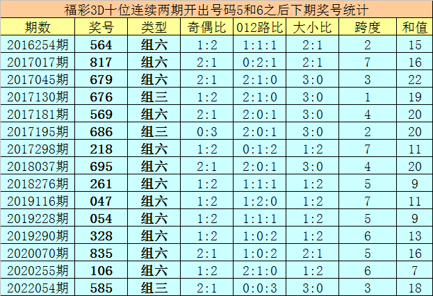 十位号码:前两期十位分别出现奖号5-6,历史上福彩3D连续前后分别开出号码5-6的现象共开出78次。在十位5-6的现象出现时,最近15期其下期分别开出号码:564-817-679-676-569-686-218-695-261-047-054-328-835-106-585;
