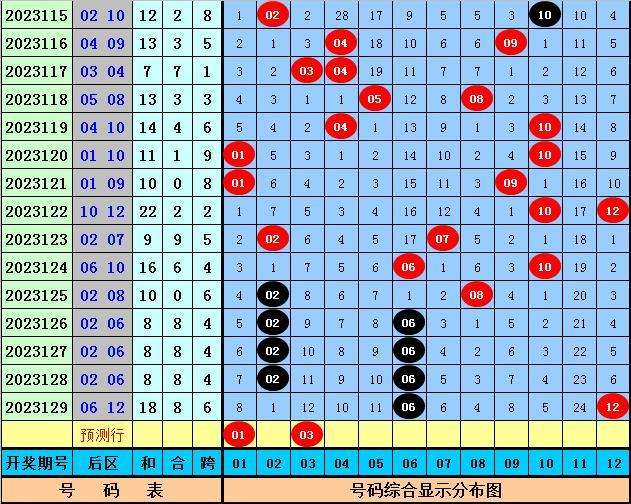 第2023129期大乐透奖号为01 12 13 15 30 + 03 0709 23 25 27 33 + 06 12,其中前区号码奇偶比为5:0,大小比为4:1,012路比为3:1:1,后区号码和值为18,跨度为6。