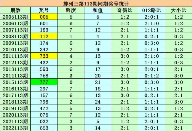 号码跨度:在第114期同期奖号中,跨度开出频次分别为:跨度3开出4期,跨度6、7开出3期,跨度2、4开出2期,跨度1、5、9开出1期,跨度0、8没有出现。去年同期开出6,本期看好跨度下降,一码跨度参考3。