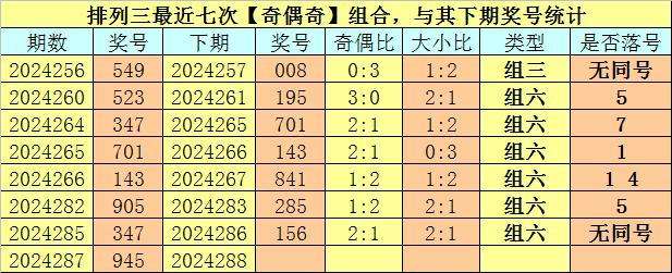 奇偶分析:排列三上期奖号为945,其奇偶类型为【奇偶奇】,最近七次出现奇偶类型奇偶奇的号码分别为:549、523、347、701、143、905、347,其下期奖号分别为:549、523、347、701、143、905、347。其中号码奇偶比为11:10,奇偶奖号开出比例基本相当,本期奇数热出的可能性较大,预计出现2个奇数号码。