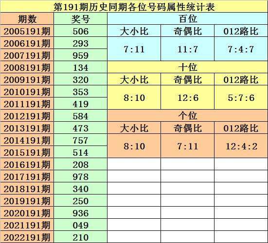 在第191期历史同期开奖中,号码0-9出现频次从高到低分别为:号码3→8次;号码0、4、5、9→7次;号码2→5次;号码1、7→4次;号码8→3次;号码6→2次。一般来说,表现最热的号码:3+0459中至少出现1个奖号。同时奖号不会全部出现在表现最冷的号码中。