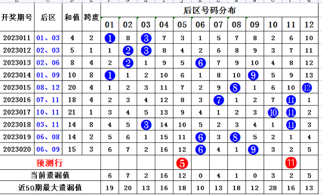 后区冷热分析(最近5期未开出的号码为冷号):上期大乐透后区开出号码06 09,近十期开出冷冷形态2次,冷热形态2次,热冷形态2次,热热形态4次。本期推荐冷热形态开出,本期推荐5码:05 08 09 11 12,参考号码05 11。