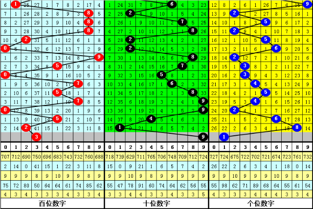 十位分析:上期奖号为1,下降3点,本期参考号码9。