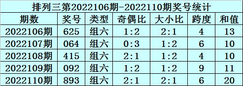 组选类型判断:最近5期排列三开出4次组六号码,本期重点关注组六号码出现。