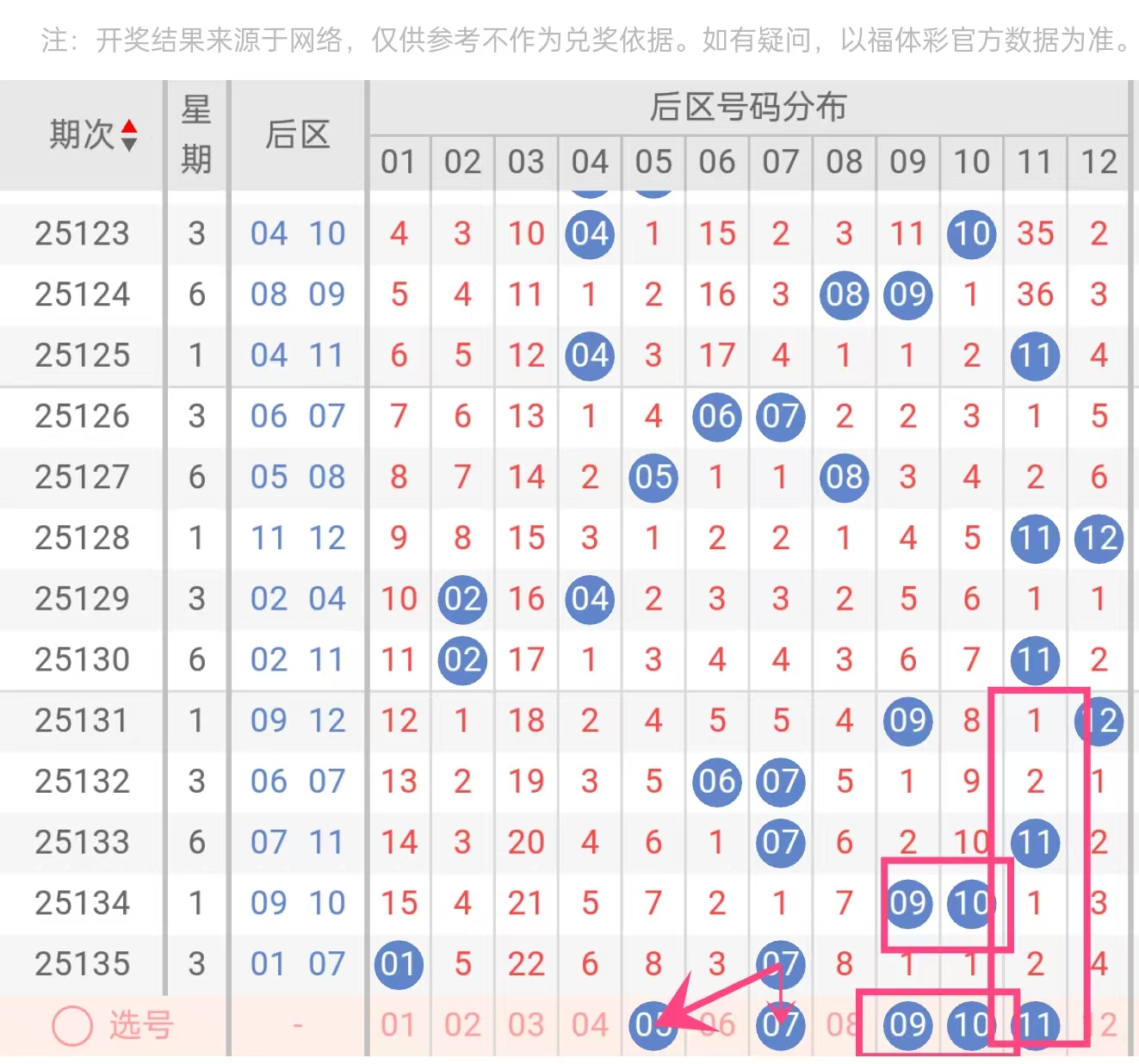 后区选号05、07、09、10、11,理由如下: