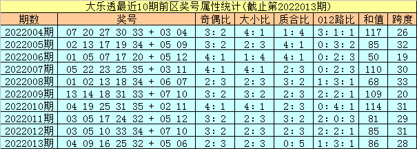 大乐透第22013期开奖,当期开奖号码为:前区04 09 16 25 32,后区05 06。当期前区号码大小比为2:3,奇偶比为2:3,三区比2:1:2,前区没有开出重号和连号;后区开出小小组合05 06。