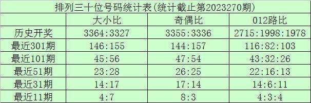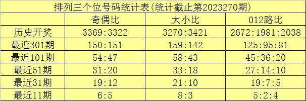 上期回顾:排列三第2023270期奖号为:355。奖号形态组三,大小比2:1,奇偶比3:0,012路1:0:2。