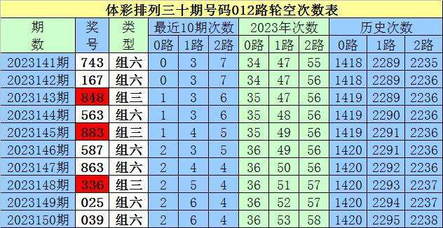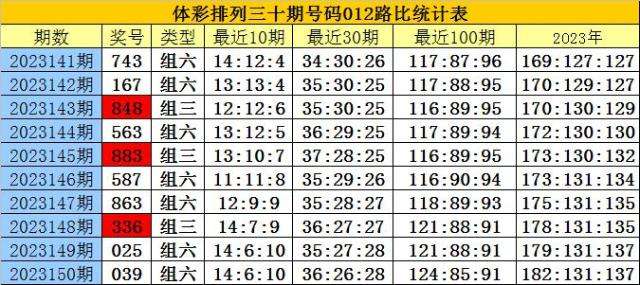 开奖回顾:排列三第2023150期奖号为:039,号码012路比为3:0:0。