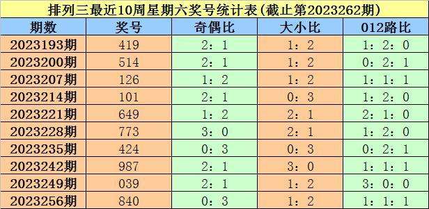 上期回顾:排列三第2023262期奖号为717。其中奖号奇偶比为3:0,大小比为2:1,012路比为0:3:0。