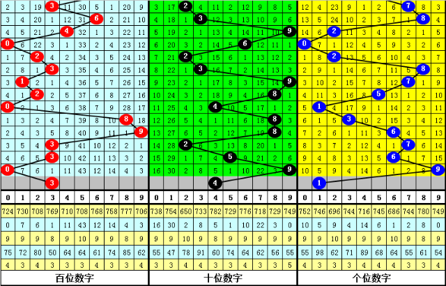 跨度分析:最近周五跨度出现范围在2-9区间,跨度比较集中,上周五跨度为6,跨度上升了1个点位,本期预计跨度下降,参考跨度3。
