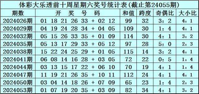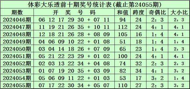 体彩大乐透第24055期奖号为:07 17 22 30 34 + 05 07。前区奖号和值为110,跨度为27,奇偶比为2:3,大小比为3:2。后区奖号和值为12,跨度为2。