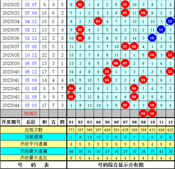 上期开奖:体彩大乐透第2023044期奖号为02 06 07 08 15 + 07 10,前区三区比为4:1:0,奇偶比为2:3,和值为38,012路比为2:1:2。