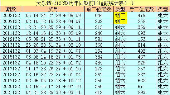 在大乐透第132期历年同期奖号中,前区后三位尾数出号频次分别为:尾数3出现7个,尾数9出现6个,尾数7、8出现5个,尾数2、4、5、6出现4个,尾数1出现3个,尾数0没有出现。其中尾数数字三类型豹子、组三、组六次数比为0:0:14,今年同期后三位尾数类型参考组六;