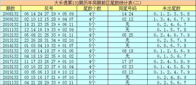 大乐透历年同期第132期后区尾数奇偶比为17:11,最近5年尾数奇偶比为5:5,后区尾数大小比为8:20,最近5年尾数大小比为1:9,本期后区注意号码03、04、05、07、09,后区两码关注07、09。