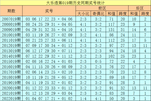 5、前区大小比分析:在第019期历史同期奖号中,前区奖号大小比为42:38,大号表现较热,最近5年前区同期大小比为3:2、3:2、3:2、2:3、1:4,今年第019期注意小号热出,关注大小比2:3。
