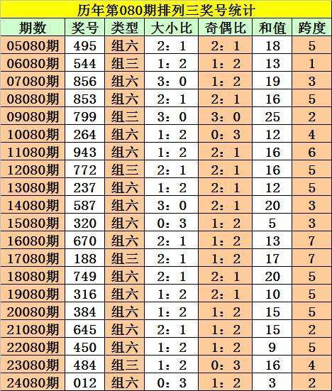 排列三第2024080期奖号:012,和值3,跨度2,大小比0:3,奇偶比1:2。