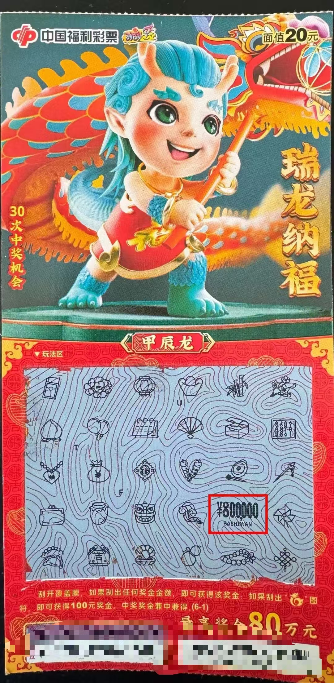 "瑞龙纳福"作为今年福彩推出的生肖主题即开票,最高奖金达80万元。票面设计融入了中国传统龙纹元素,寓意吉祥如意。销售人员王女士回忆,当晚小张刮开彩票时,先是愣了一下,随后反复确认中奖金额。"当他看清真的中了80万时,整个人都跳起来了,我们站里的人都为他高兴!"