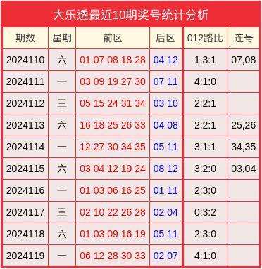连号分析:上期无连号,近10期前区连码共开出4次。本期预测不会开出连码组合。