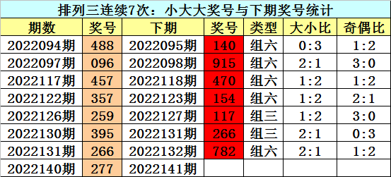 大小判断:上期排列三奖号为277,大小为:小大大,近7次大小为小大大的奖号为:488-096-457-357-259-395-266。
