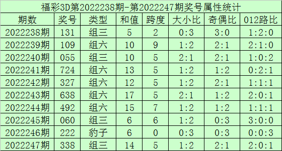 开奖回顾:福彩3D第2022247期开奖号:338,其中奖号和值:14,奇偶比2:1,大小比1:2。