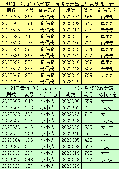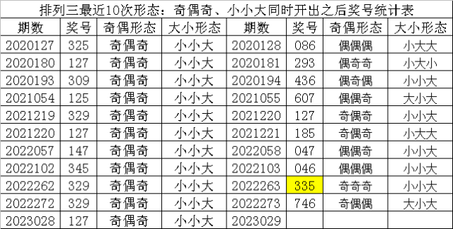 排列三最近10次同时开出奇偶形态:奇偶奇和大小形态:小小大时其奖号分别为:325-127-309-125-329-127-147-345-329-329-127,下期分别开出号码为:086-293-436-607-127-185-047-046-335-746,详细统计见下表: