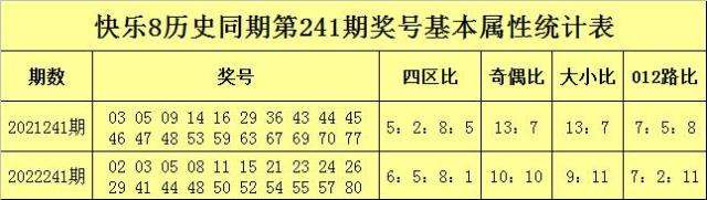 万妙仙快乐8历史同期第241期奖号基本属性分析