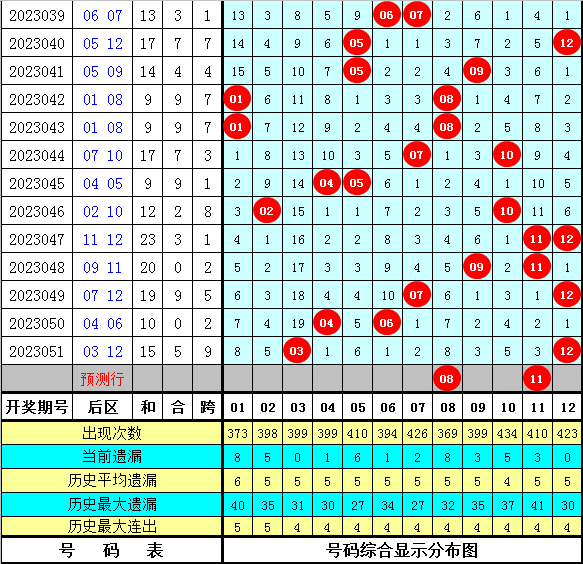 后区上期开出奖号:03+12,前6次后区奖号03+12出现之后,其下期分别开出号码:02+05、06+12、01+06、05+06、10+11、11+12,本期后区注意五码04 05 08 11,单挑两码08 11。