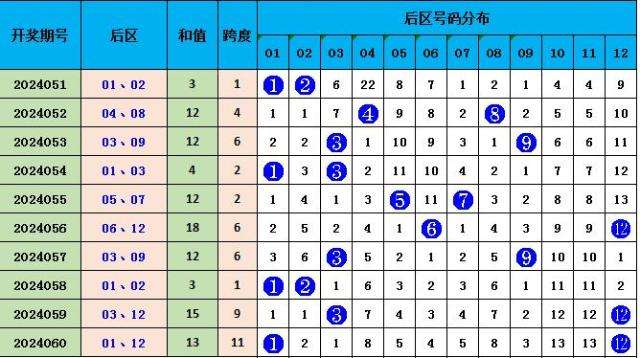 上期后区开出小大组合01 12,本期后区推荐小小组合03 06。