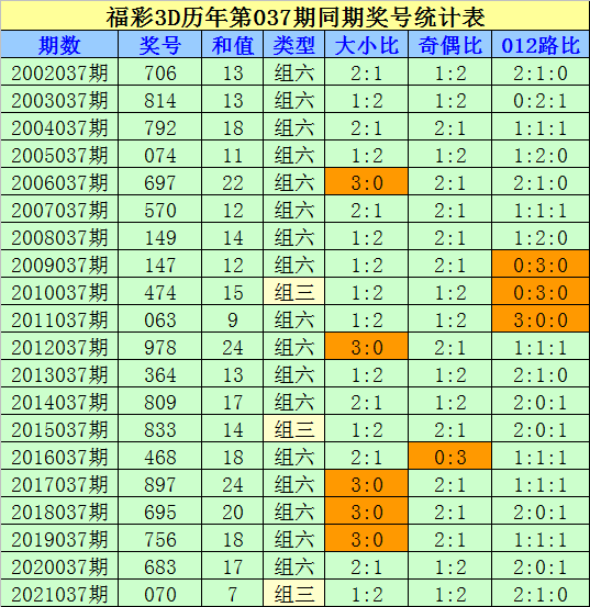 组选类型判断:在第037期历史同期开奖中,组六开出17次,组三开出3次,今年同期防开出组三号码。