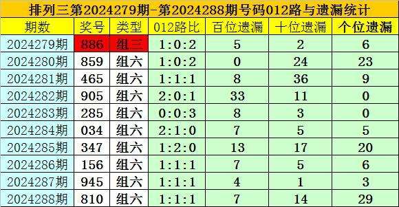 开奖回顾:排列三第2024288期奖号为:810,类型为组六,号码012路比为1:1:1,百十个位号码直选分别遗漏7期、14期和29期。