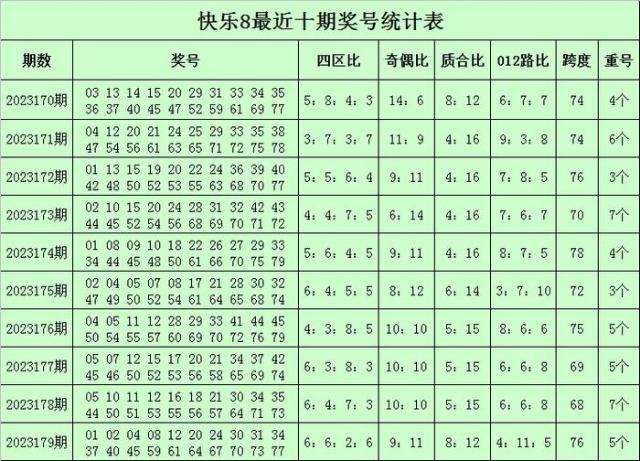 福彩快乐8第2023179期开奖回顾:01 02 04 08 12 20 24 30 31 34 37 40 45 59 61 64 67 70 73 77,其中奖号四区比为6:6:2:6,奇偶比为9:11,质合比为8:12,跨度为76,012路比为4:11:5,开出5个重号:12、30、34、64、73。