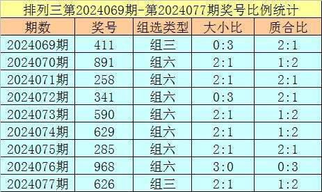 上期回顾:排列三第2024077奖号开出626,奖号质合比为1:2,大小比为2:1,跨度为4,类型为组三。