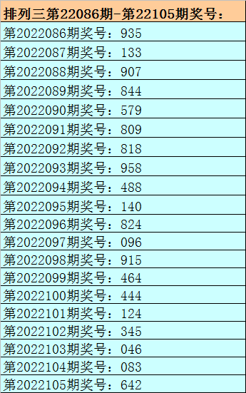 开奖回顾:排列三第2022105期开出奖号:642。其中奖号大小比为1:2,奇偶比为0:3,012路比为1:1:1,和值为12,跨度为4。