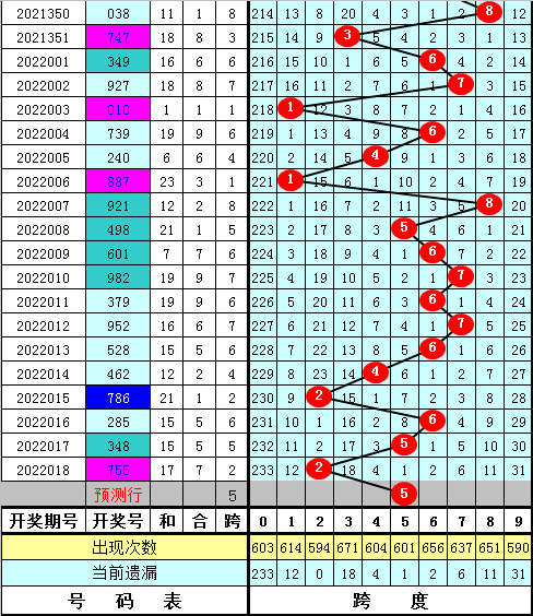 福彩3D第2022018期最大跨度开出2,跨度近期分布比较密集,主要分布在2-6区段,本期预计最大跨度在3-7区段出现,最大跨度关注34567,精选跨度5。