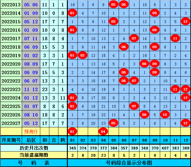 后区分析(定义:01-04为一区,05-08为二区,09-12为三区):上期后区开出奖号05和12二区和第三区和区,,最近10期后区三个区间落号个数比为4:8:8,本期后区看好第二区号码大热,注意两码01、04。