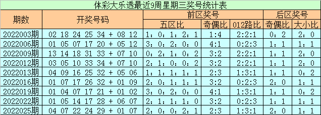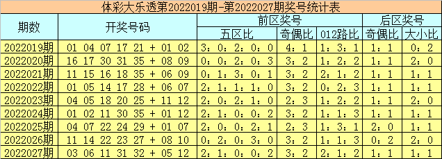 体彩大乐透第2022027期奖号为03 06 11 31 32 + 05 12,前区号码五区比为2:1:0:0:2,奇偶比为3:2,012路比为2:1:2,后区号码奇偶比为1:1,大小比为1:1。