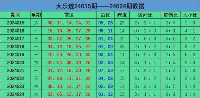 前区的跨度为23、奇偶比为3:2,后区号码开出01 12,为小大形态。